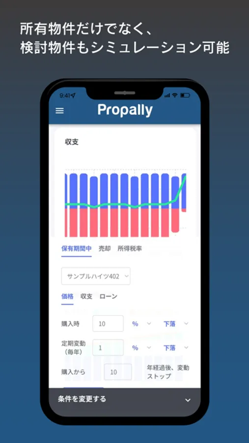 お持ちの物件の将来収支のほか、これから購入される方の事前シミュレーションにもお使い頂けます。