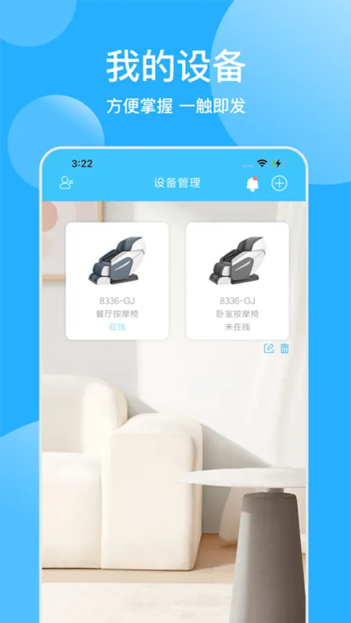 顾家按摩椅APP,是顾家旗下辅助物联网设备按摩椅使用的软件平台。辅助用户方便快捷的使用按摩椅设备进行按摩。