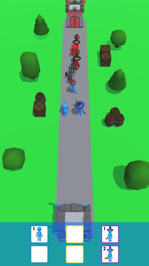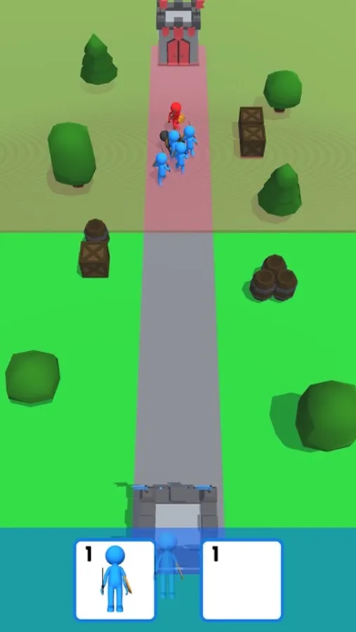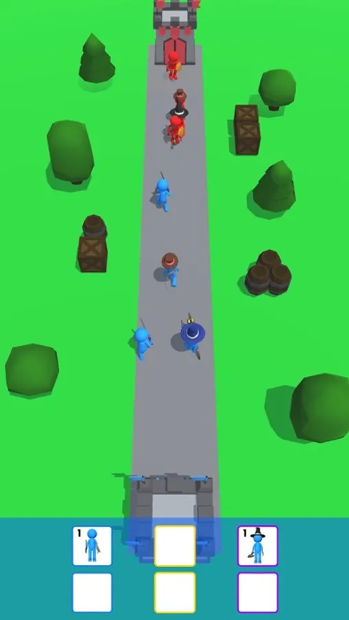 Soldiers that appear over time are placed on the field by swiping to march toward the enemy fortress.