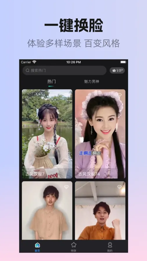 各色各样的潮流模板,一键帮你制作。汉服、古风、旧上海旗袍,喜欢哪一个都可以一键制作,只需要一张照片,让你自己变成视频的主角。