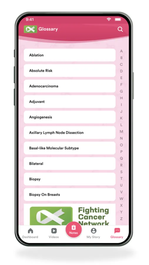 The Glossary provides in-depth information about some of the terms used in your cancer journey. Understanding complicated or even unfamiliar terms helps in your ability to comprehend the important information from the video library.
