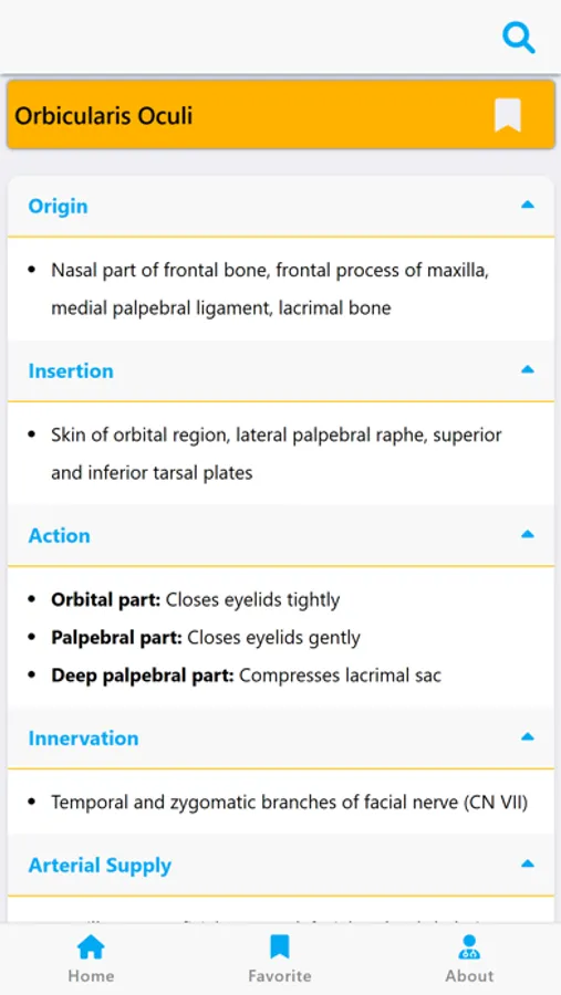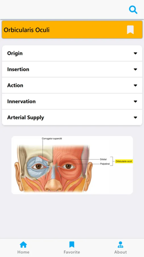 Each region is divided into the muscles of that region. Each muscle is explained as: the origin of the muscle, the insertion, the action, innervation and blood supply of the muscle. And each muscle section contains a simple image of it.