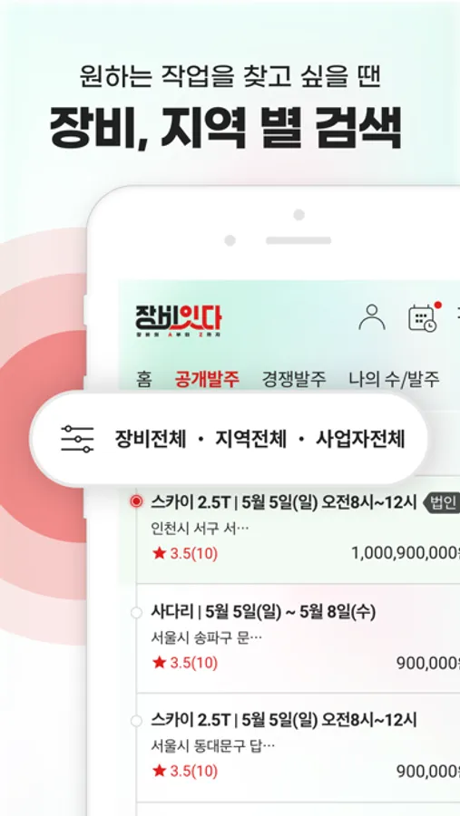 원하는 작업을 찾고 싶을 땐 장비, 지역별 검색