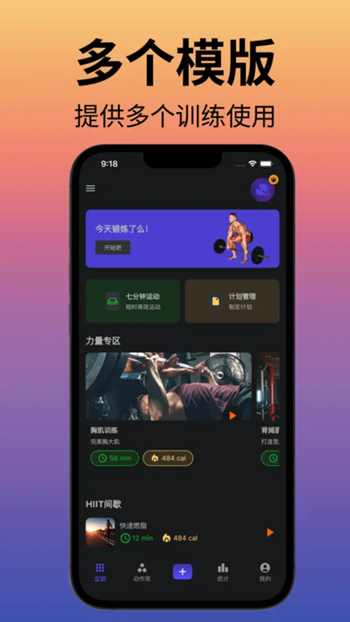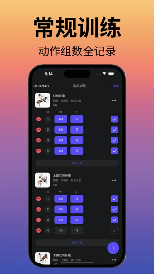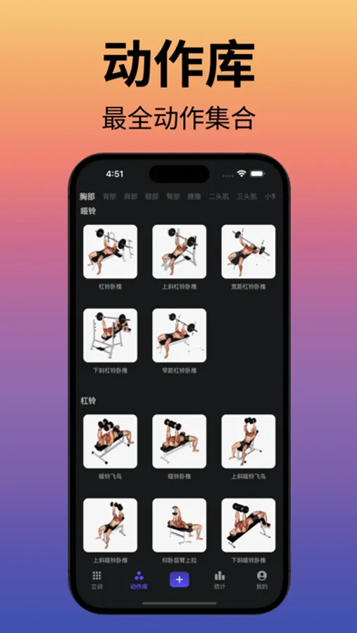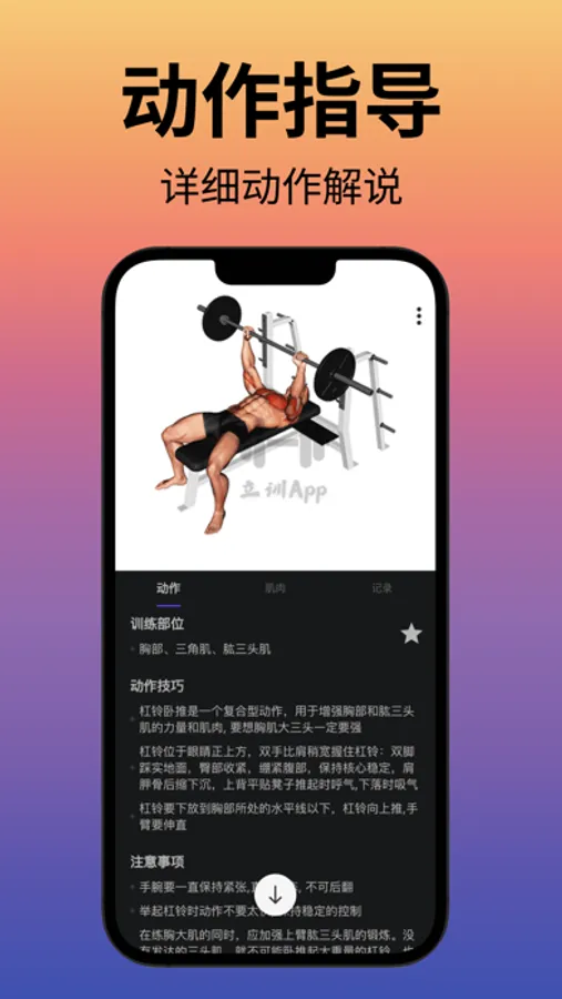 1. 500+训练动作指导, 并配置专业的动作介绍,保存你训练动作最大重量, 卧推、深蹲、硬拉、拉伸、有氧、hiit等