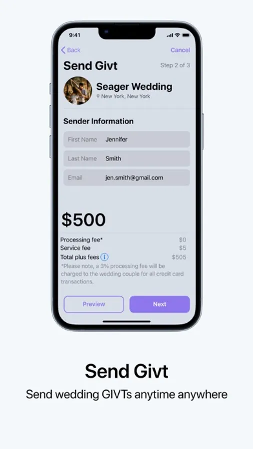As a guest, skip the trip to the card aisle and create a personalized post complete with a photo, a meaningful message and a cash gift, all on the app. For a flat $5 service fee, save time and money by sending a one-of-a-kind gift. No more checking to see if the check was cashed or waiting around for the thank you card, with the app, you get an instant confirmation that the gift was sent and received. Givts can be sent from your couch, from your car, or even on the dance floor, before, during or after the event so there’s no rush and no problem if you forget on the big day.