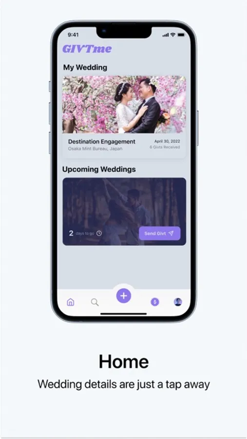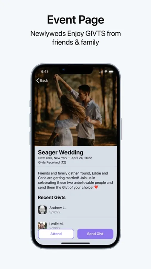 Givtme facilitates the giving and receiving of your digital cash wedding gifts without losing the personal touch of a written card. The morning after your wedding, you wake up with all the gifts securely and efficiently collected on your event page ready to scroll through and enjoy. No need to deposit checks, count cash or create a spreadsheet. The cash is already en route to your chosen account and the app keeps everything organized in one place where you can revisit your messages and posts any time you want. No hassle, no waste, just peace of mind.