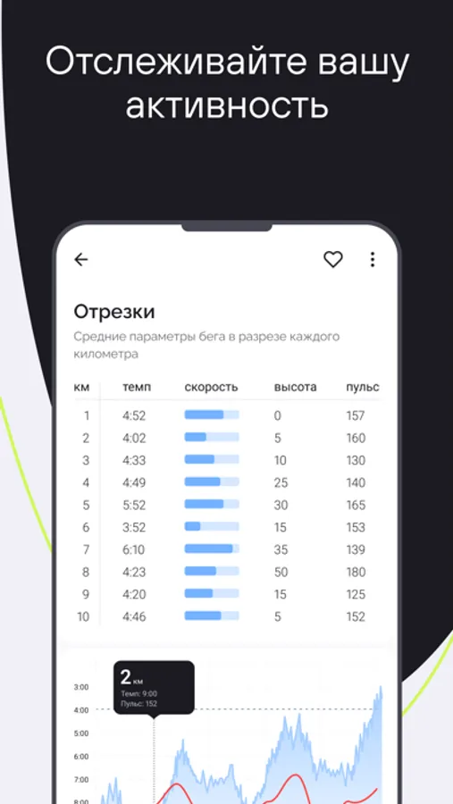 - Отслеживать эффективность тренировок в динамике, чтобы достичь фитнес целей и беговых результатов