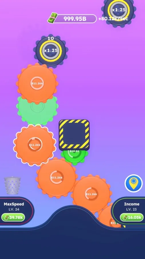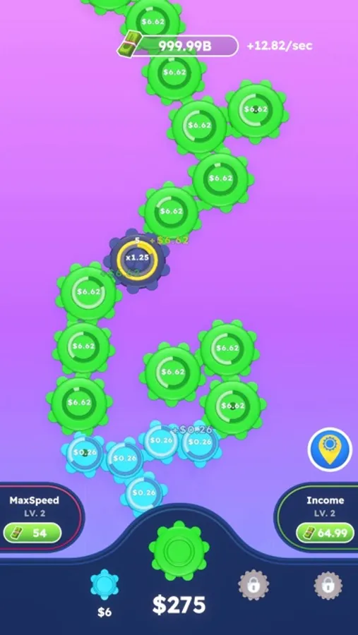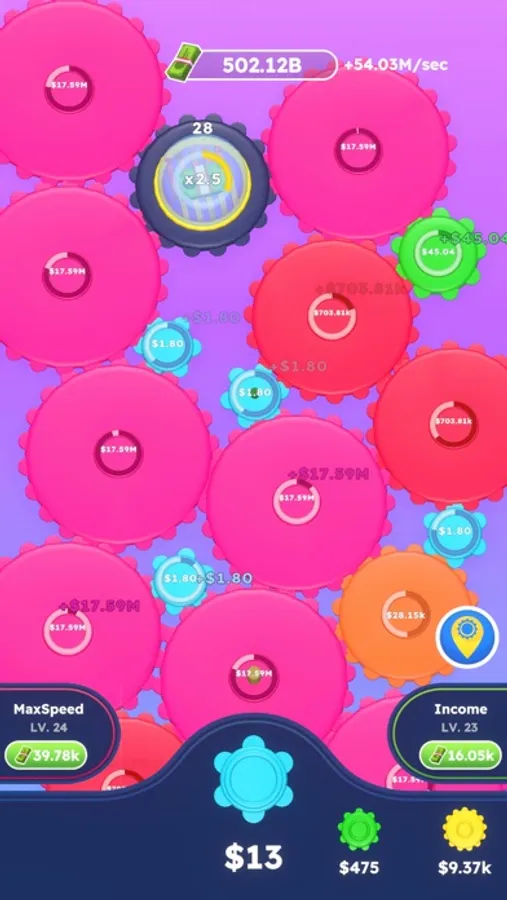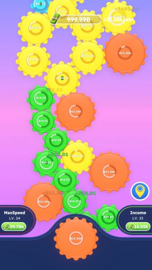 Can you install the most advanced system? Start with the smallest cog and reach new cogs. The new cogs will earn you more. Set up the system and earn your money. Place new cogs and buy new areas.