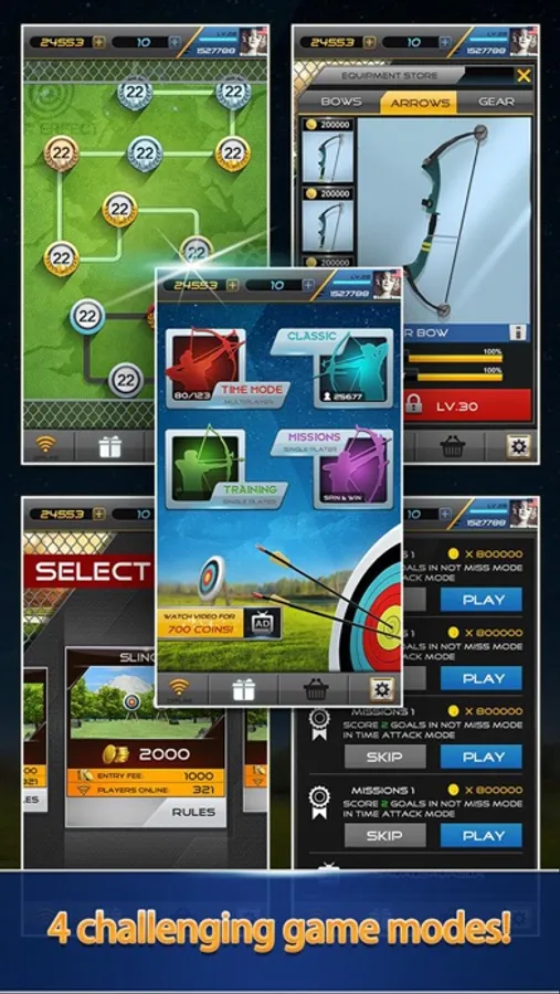 There are both online and offline modes. Challenge your archery skill in various bow games. If you want to compete with other players online or join a archery tournament, try Rush and Classic mode. Want to have some fun by shooting arrows to the target? You can practice your skills offline in Missions and Training mode.