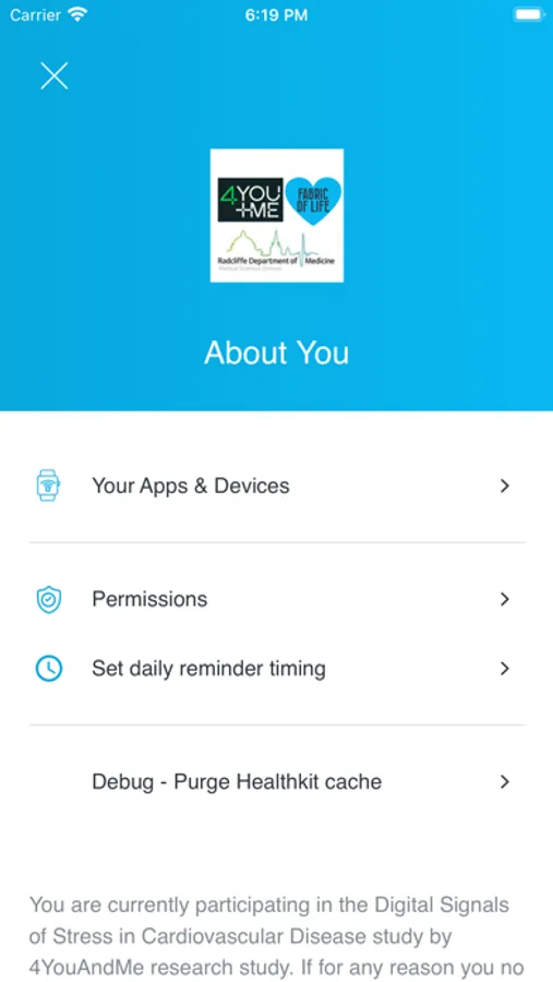 This app is for participants in the Fabric of Life research study by 4YouandMe. In this research study, we would like to see if objectively measured data from different smart devices can quantify real-world individual level stress. This study has been reviewed and approved by a Research Ethics Board.