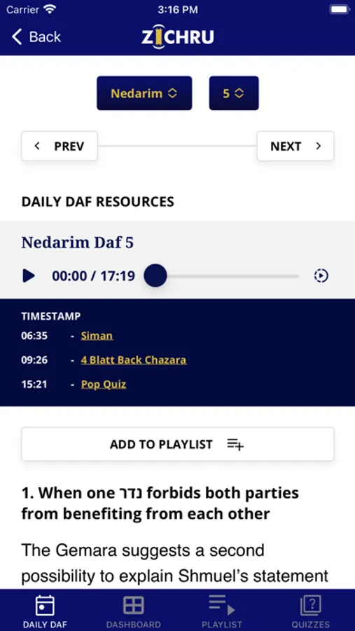 - Playlist feature to personalize review of multiple shiurim and quizzes from different masechtos