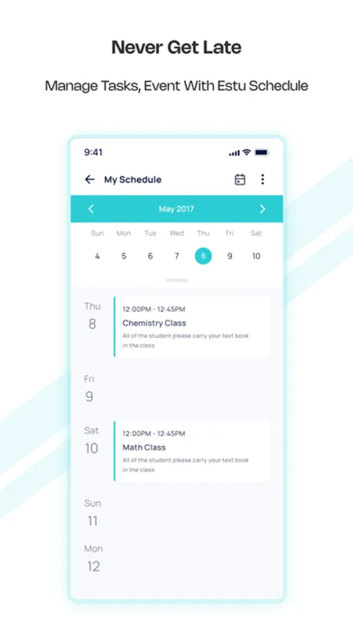 Estu further offers a sophisticated calendar feature that empowers students to effortlessly manage their academic commitments, classes, and upcoming events.