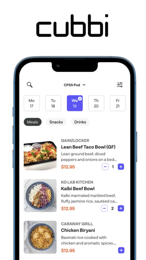 Why Cubbi? If your workplace, gym, or apartment building has a Cubbi, use our app to order fresh meals. Meals are delivered daily to Cubbi locations all over the city. Pick up your meals from our secure refrigerated pod when convenient.