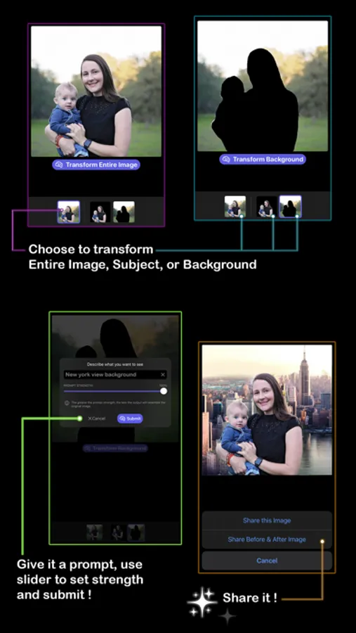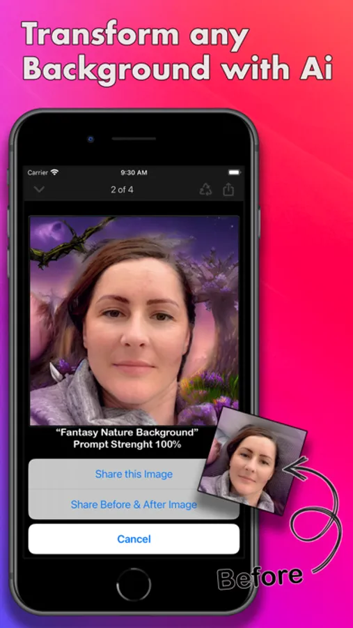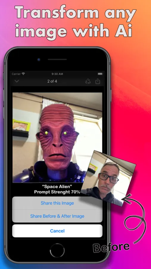 Transform any photo with the power of artificial intelligence. Create images of anything you can imagine from a text description that you write yourself. Transform images of people and pets into celebrities, monsters, zombies, older or younger versions of themselves or create completely new images from any text prompt. You must experience the power of AI image generation for yourself.