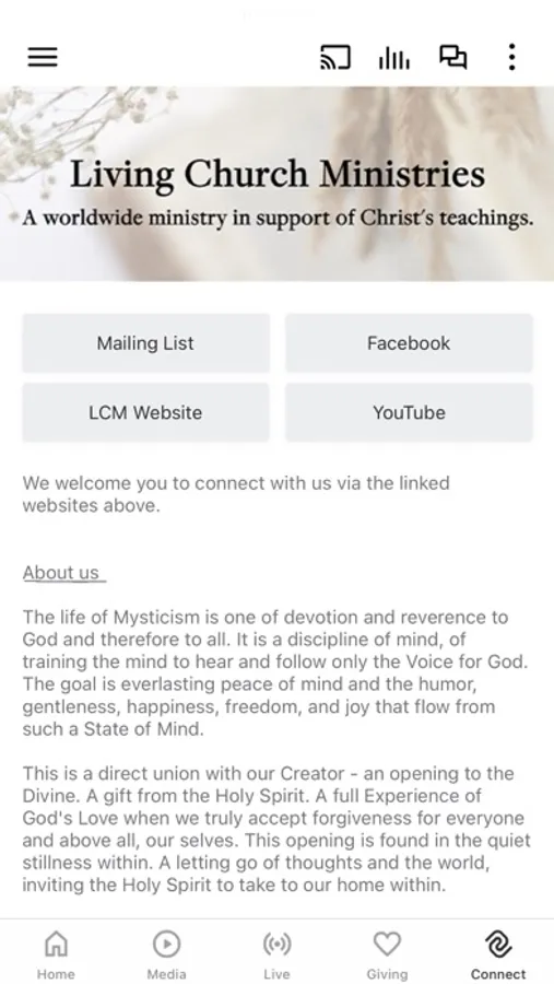The LCM app from "Living Church Ministries, Inc." offers the deepest practical Christian teachings from renowned teacher David Hoffmeister. Receive notifications of live events and join us instantly! Explore our library of inspirational music, podcasts and videos. Feel uplifted with our "Daily Inspiration" messages.