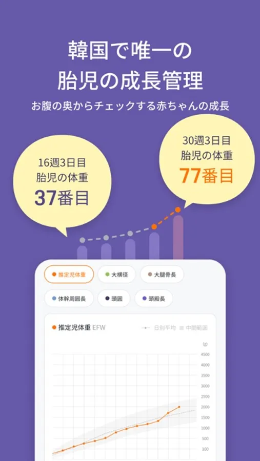 3) 推定児体重(EFW), 大腿骨長(FL)など5つの胎児成長数値を通じて、赤ちゃんがお腹の中でよく成長しているかグラフで確認してください。