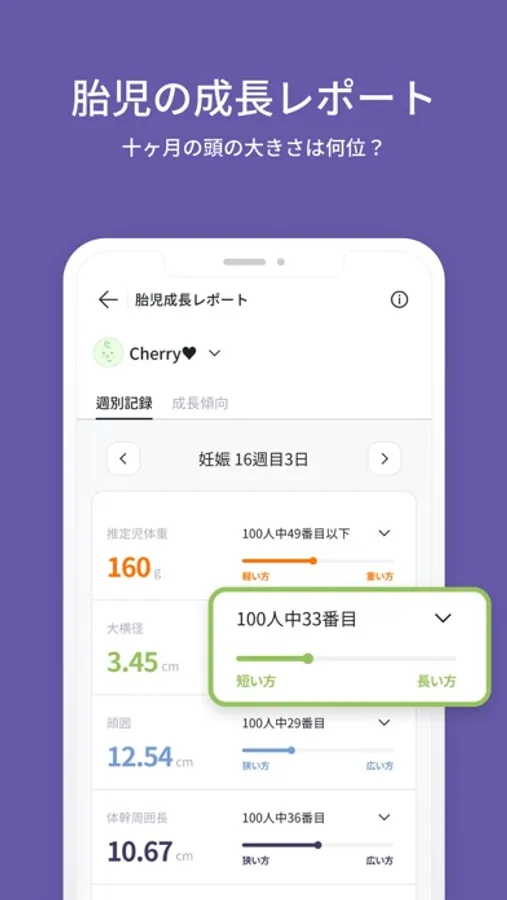 · 出産予定日を基準に週数別胎児の成長グラフ及び妊娠週数別情報提供