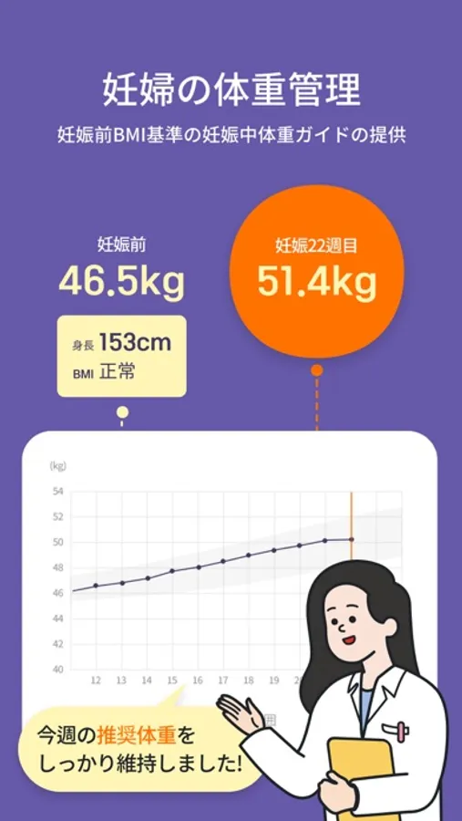 · 妊娠中の妊婦の体重管理のため、妊娠前BMIを基準に週数別推奨体重増加範囲ガイドを提供(妊婦の週数別推奨体重増加範囲の場合,日本産科婦人科学会の「妊娠中の体重増加指導の目安」を参考)