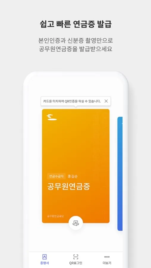 이제 공단에 방문하지 않고 모바일에서 본인인증과 신분증 촬영만으로 공무원연금증을 발급받을 수 있습니다.