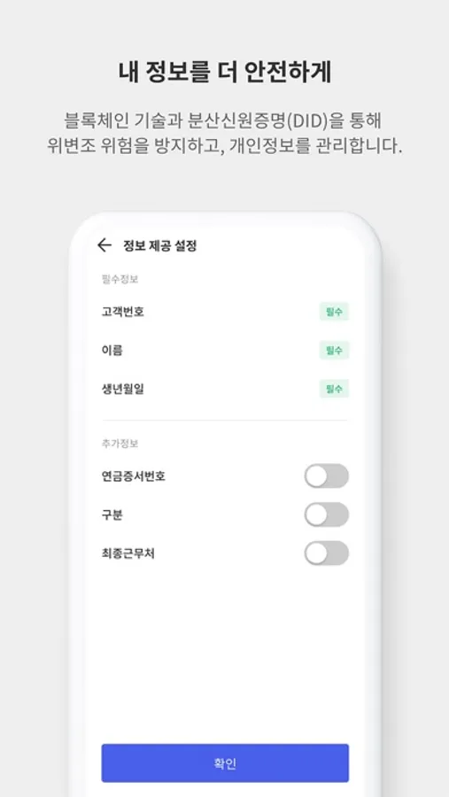 블록체인과 분산신원증명(DID) 기술로 위변조 위험을 방지하고 개인정보를 안전하게 관리합니다.