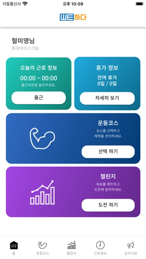 WE하다의 어플리케이션을 통해 간편한 로그인, 편리한 출퇴근 기록, 다양한 휴가 신청, 맞춤형 운동코스 선택, 함께하는 건강한 습관 만들기 챌린지, 한눈에 볼 수 있는 근로정보, 빠른 공지사항 알림을 확인해보세요.