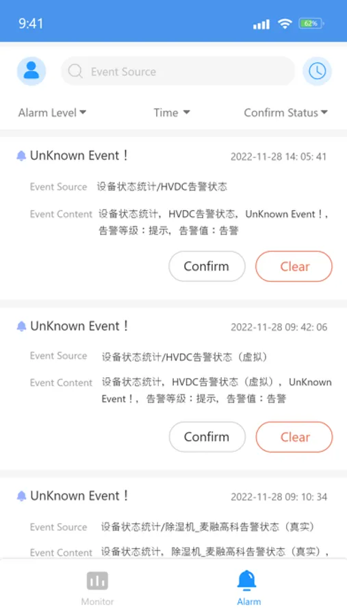 You can filter real-time alarms by alarm level, event source, acknowledgment status, and alarm occurrence time on the app.