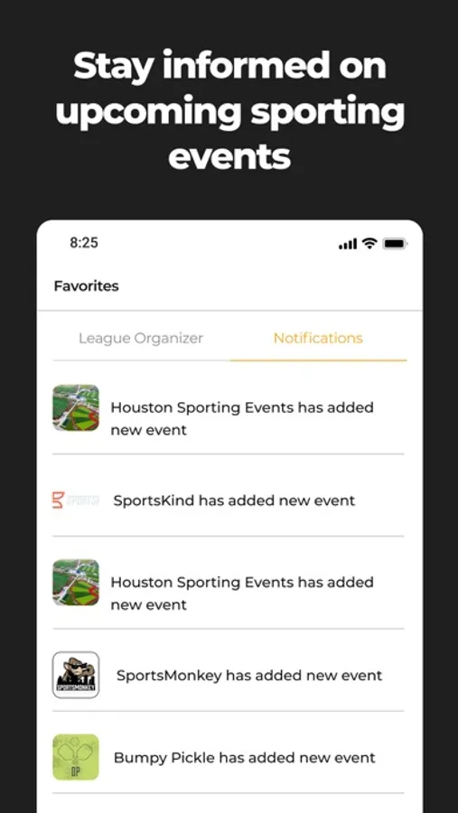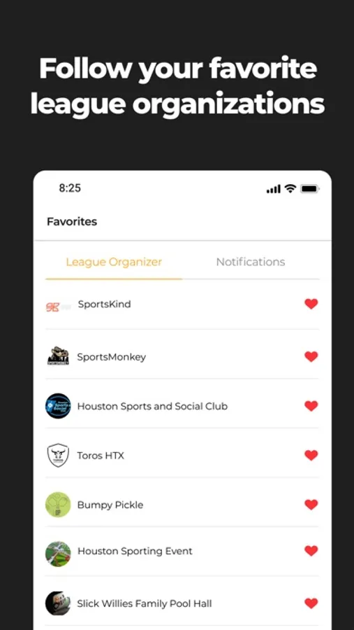 Receive alerts for upcoming leagues, tournaments and more from your favorite league organizers.
