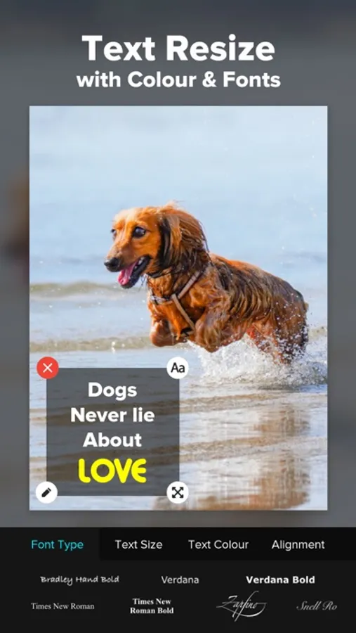 Add text on video and photos with different Font types,Text Size,Text Colour and alignment. Text Field can be resized.