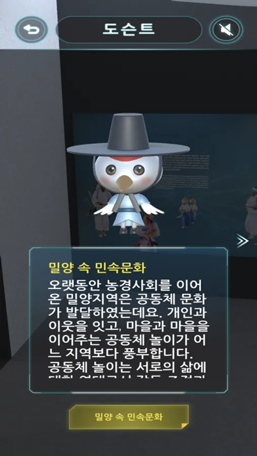 '밀양 스마트 박물관'은 온/ 오프라인 공간에서 관람객이 참여하고, 다양한 밀양의 문화유산들과 교감할 수 있는 새로운 방식의 메타버스형 스마트 박물관 앱입니다.