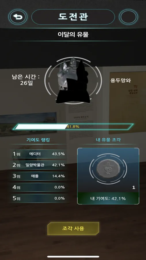 - 증강현실 박물관 : 실제 밀양 시립 박물관을 방문해 앱을 실행시키면, 실제 박물관을 다니면서 다양한 증강현실 콘텐츠들을 즐길 수 있어요. 박물관 곳곳을 스마트폰을 들고다니시는 분들은 스몸비가 아니고 관람객들이니 절대 놀라지 마세요!