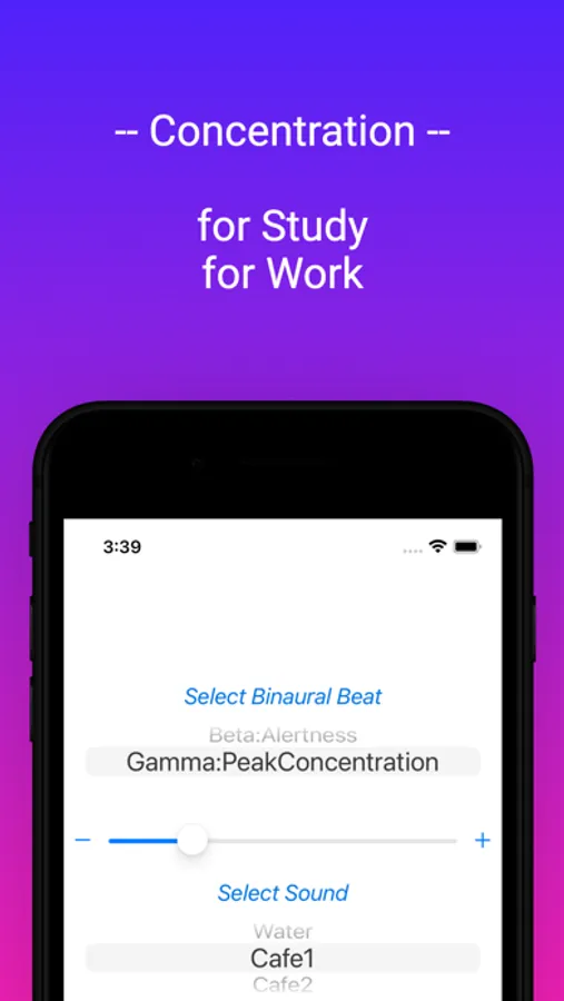 Binaural Beats and BGM allows you to choose from 5 types of Binaural Beats and many background music (environmental sounds) to get into the best state of concentration/relaxation.