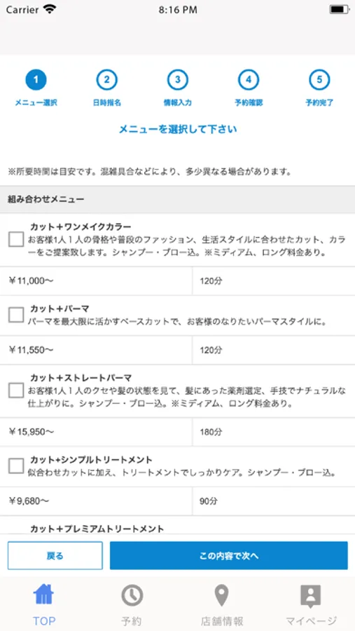 予約状況の確認やキャンセルがマイページ上から行えます。スタッフの登録が出来るので前もって担当者を登録しておけばマイページからスムーズな指名予約が可能です。