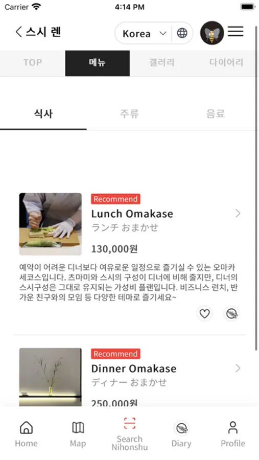 ㅇ 일본에서 생산되는 모든 사케를 브랜드명, 지역별로 검색하고, 마실 수 있는 오마카세 식당의 정보까지 제공합니다.
