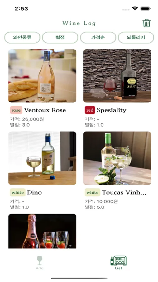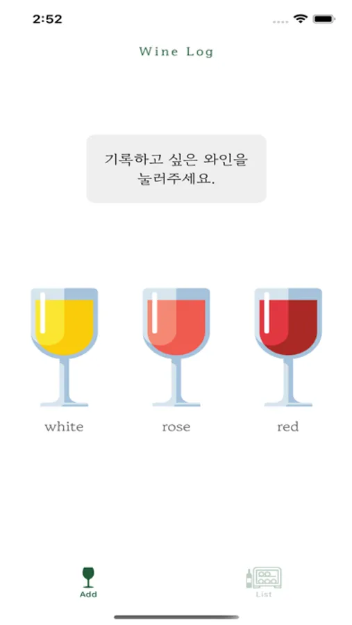 레드, 화이트, 로제의 와인종류를 선택하고, 언제 어떤 와인을 마셨는지를 기록할 수 있어요.