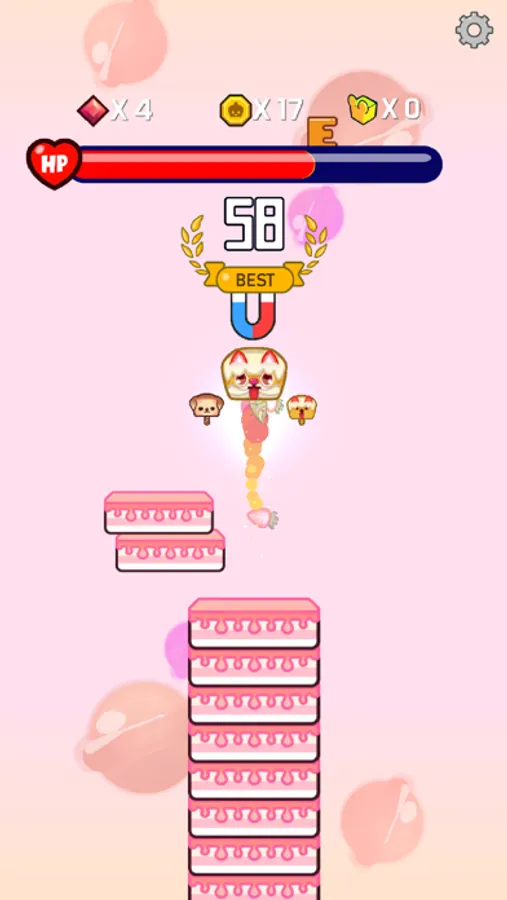 Just overcome the moving obstacles and don’t fall down. Choose your strategy: jump as much as you can with your signatured cuenimals. Jump high and eat item platforms to reach a higher stage!