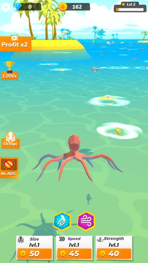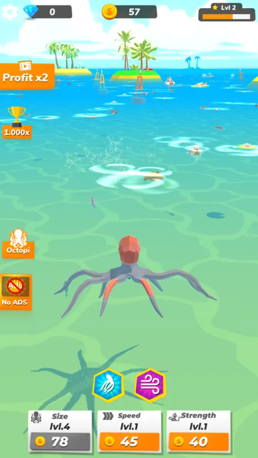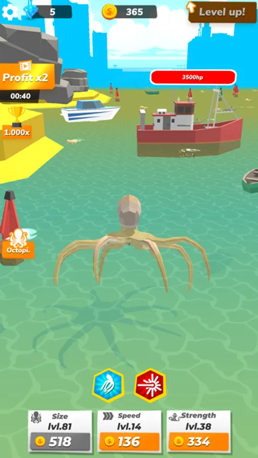 Want to create even more destruction and chaos? Upgrade your octopus to increase its tentacles strength and attack power. Grow your monster to eat more significant objects. Level up your beast to grow its speed and swimming velocity. Increase the health and attack damage of your hungry dragon. Earn better points to improve your octopus game stats. Gain experience by catching and eating your prey. It will be a bloody mess!