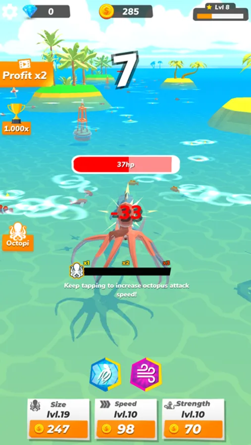 Your idle octopus must evolve to increase its power in the ocean. Remember that you are not the only predator in the coastal waters! Just click and grow, hunt and eat. Each sea beast has unique bonuses to increase your profit and strength. Evolve your fish into a great octopi, devilfish, or Kraken! They have monstrous 3D tentacles to bite! Upgrade your monster’s swimming speed, damage, and resistance levels.
