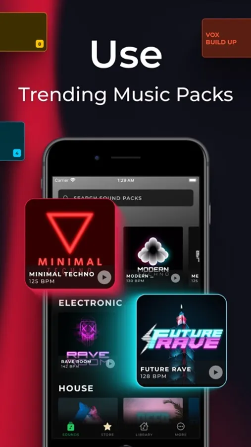 Choose between more music packs based on what type of music you want to create. In each of the music packs, there are layers of sounds such as Beat, Bass, Lead, Synth, Pluck, and many more. Each of these layers has its own sounds that should be played in an arrangement such as Intro, Break, Build Up, Drop, etc.