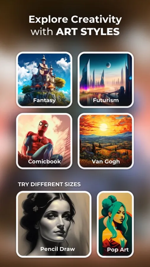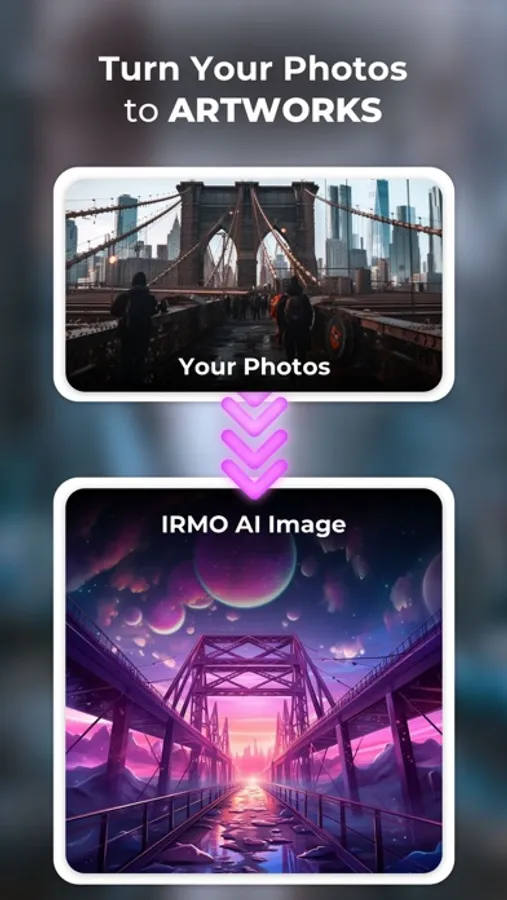 Type the scenery that comes to your mind in whatever language you want to text prompt, select one of the dozen styles that IRMO offers and within seconds unbelievable artworks will appear on your screen or upload an image from your gallery, type in what you want to do with this image and let IRMO do the rest. Let your basic doodles turn into magnificent artwork!