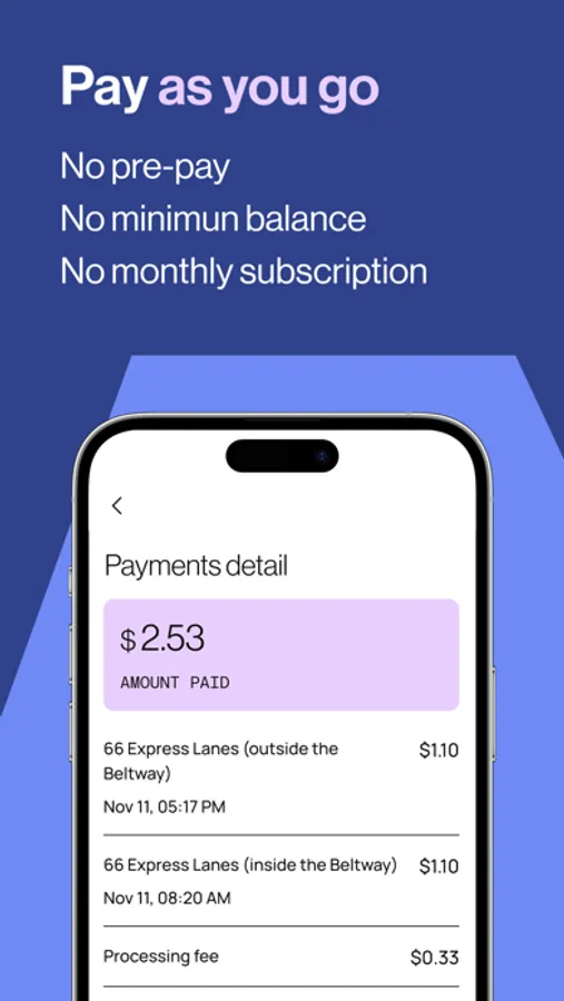 NextPass gives you more visibility and control in your toll payments. It even adapts to your driving needs, so you only pay for tolls as you go. Download the app and in a matter of minutes, you’ll be all set to pay in Virginia's fast lanes.