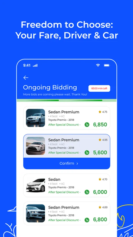 Intercity Trips: Choose your fare with our bidding feature for greater flexibility.