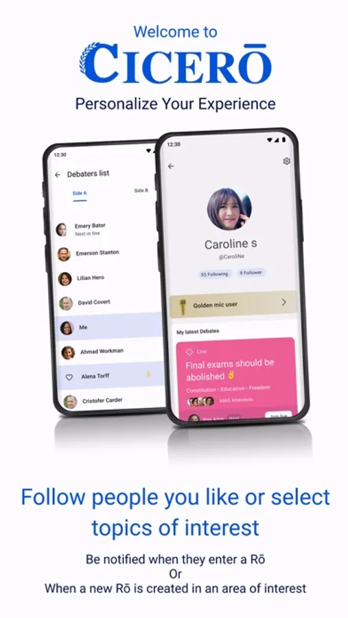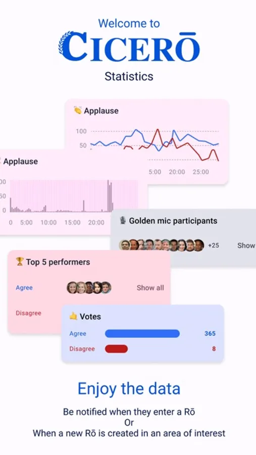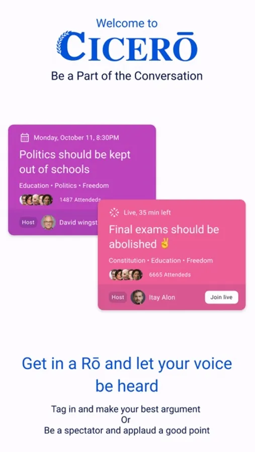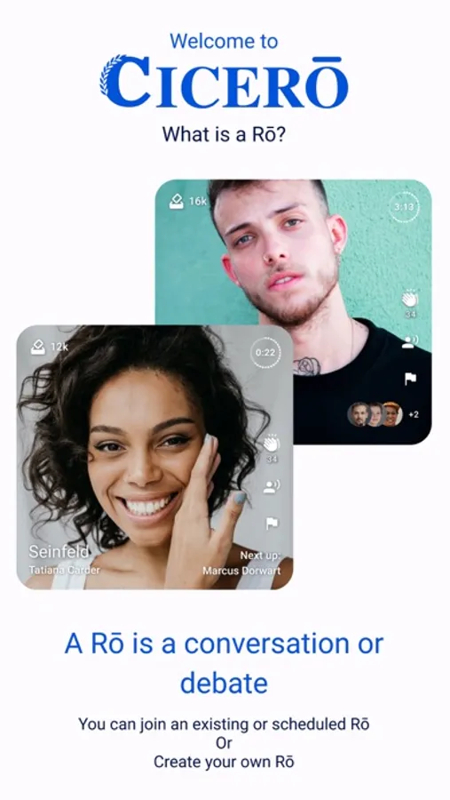 Cicero is a mobile platform that reimagines the traditional public square for a digital space. The app allows users engage in debates - or what we call a "Rō" - over live video on a any topic from sports and entertainment to politics and business. Create a public or invite-only private Rō, observe and/or participate in the discussion, and applaud strong or persuasive arguments. Then, at the conclusion, Cicero will reveal the winner, providing detailed statistics from the entire debate.