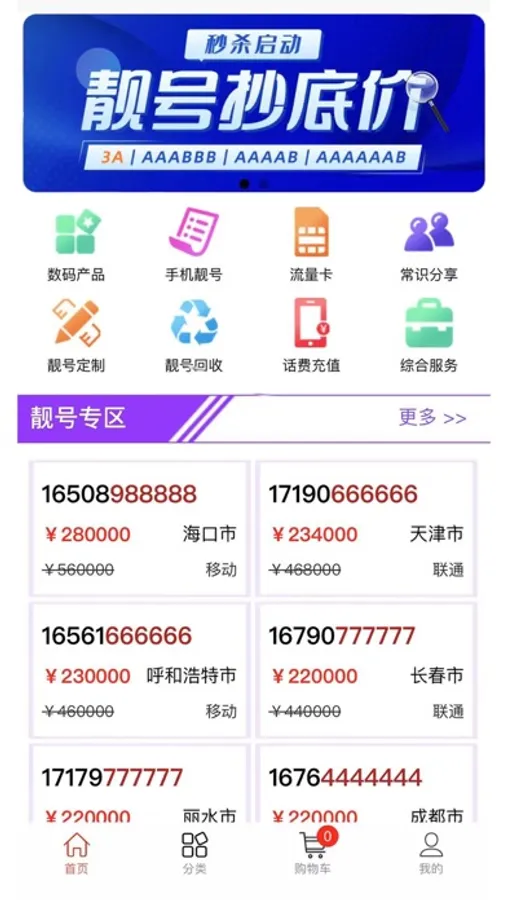 主要致力于手机靓号的销售,可以在全网范围内查找自己喜欢的手机号码,并可以定制自己喜欢的号码,会为您全网搜索,尽量满足您的需求,还可以在这里找到您喜欢的数码产品