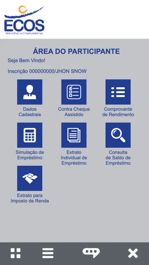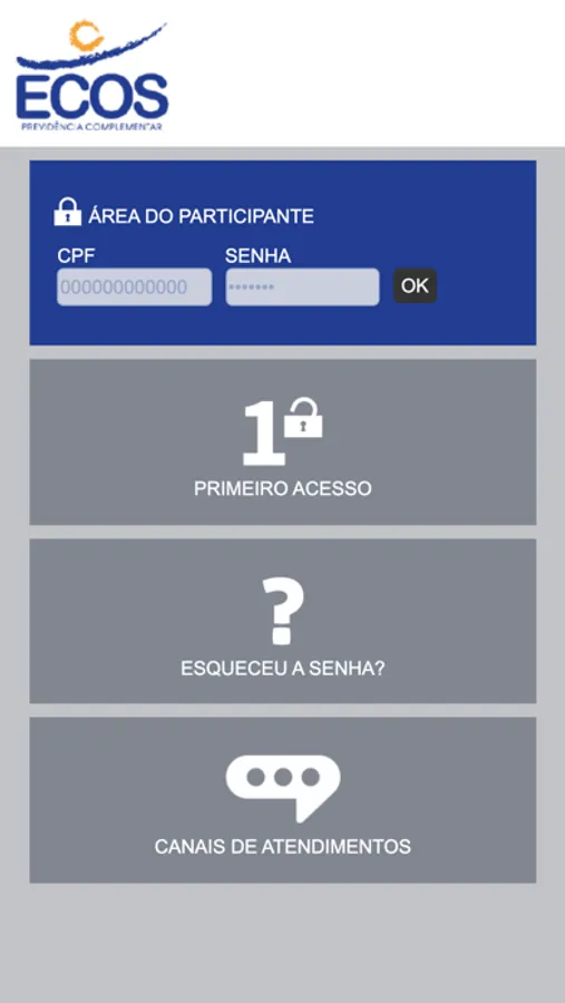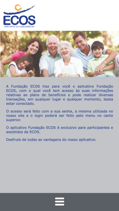 A ECOS traz para você o aplicativo “Fundação ECOS” com o qual você tem acesso às suas informações relativas ao plano de benefícios e pode realizar diversas transações, em qualquer lugar e qualquer momento, basta estar conectado. O acesso deve ser feito com a mesma senha que você utiliza no nosso site e o login poderá ser feito pelo menu no canto superior direito ao solicitar Área do Participante. O aplicativo Fundação ECOS é exclusivo para participantes e assistidos da ECOS.
