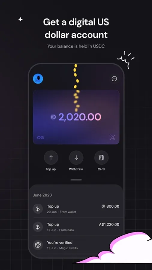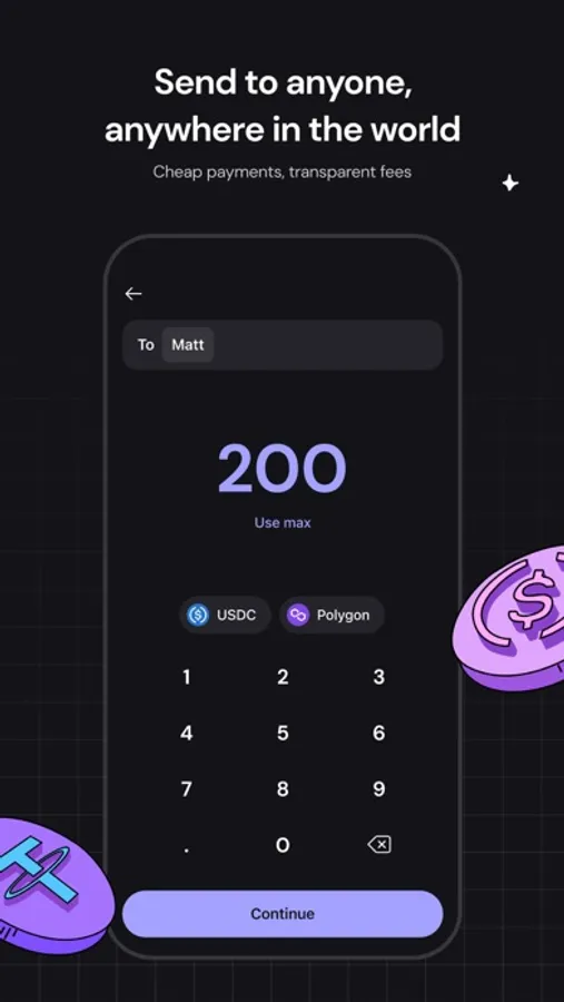 - Send & Receive - With wallet-to-wallet transfers, you can send stablecoins to anyone, anywhere in the world no bank account required.