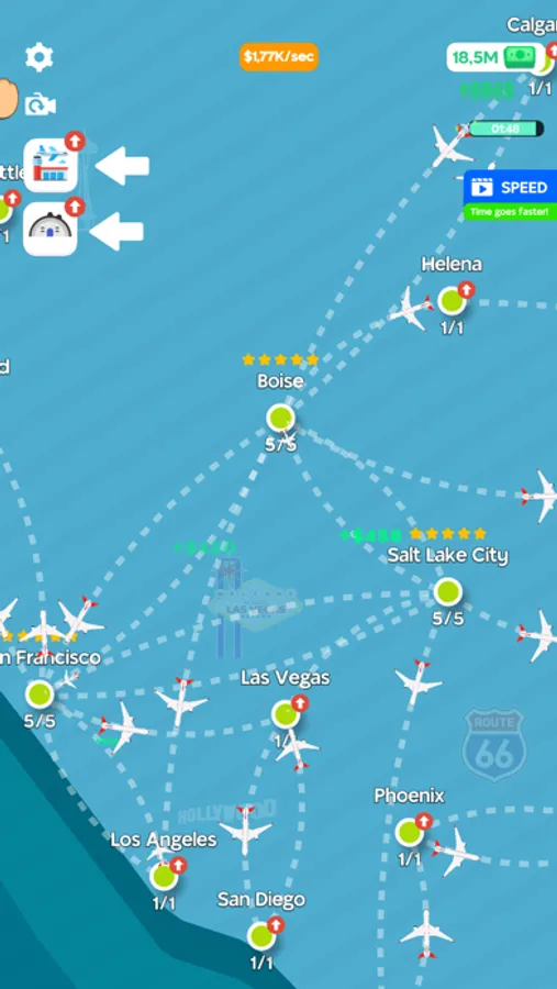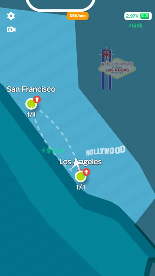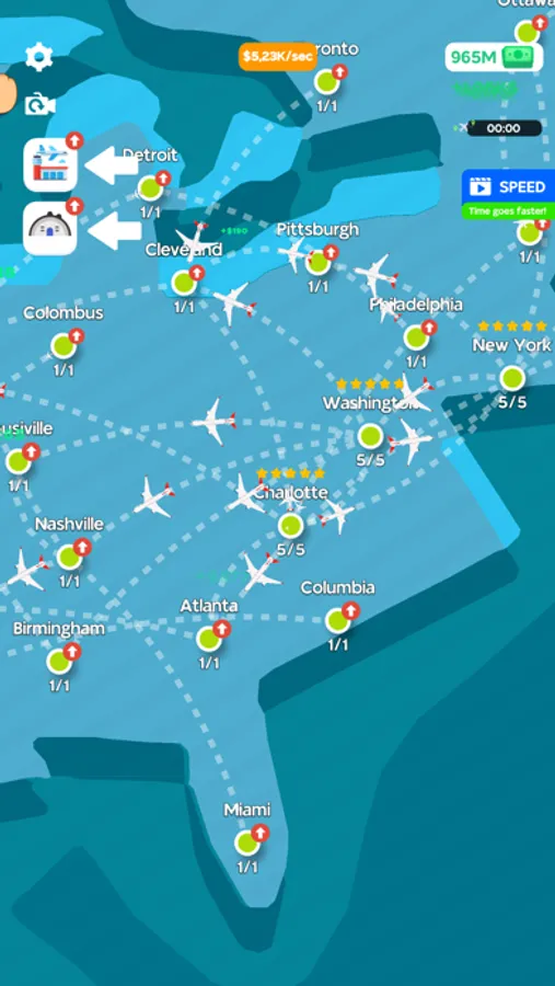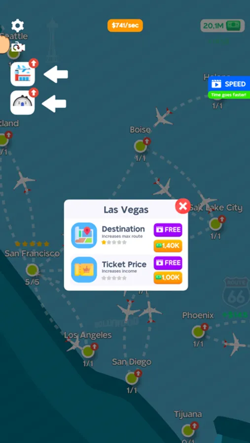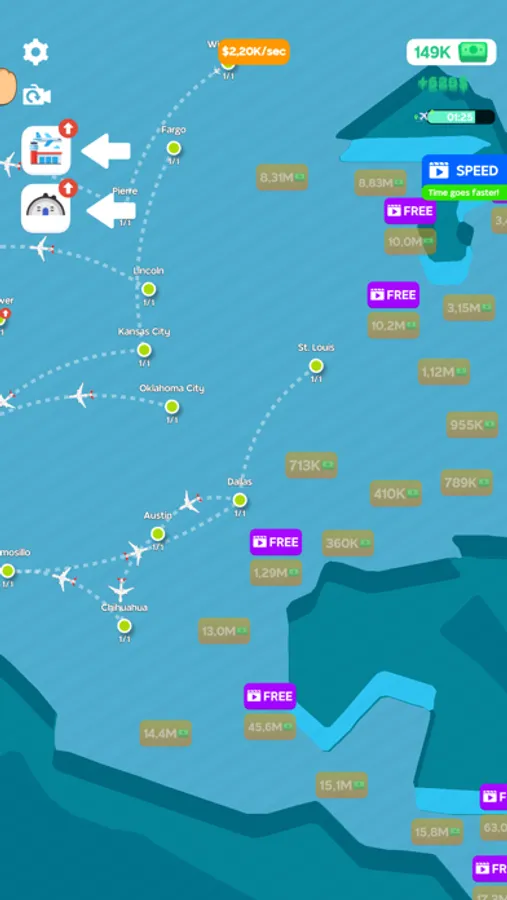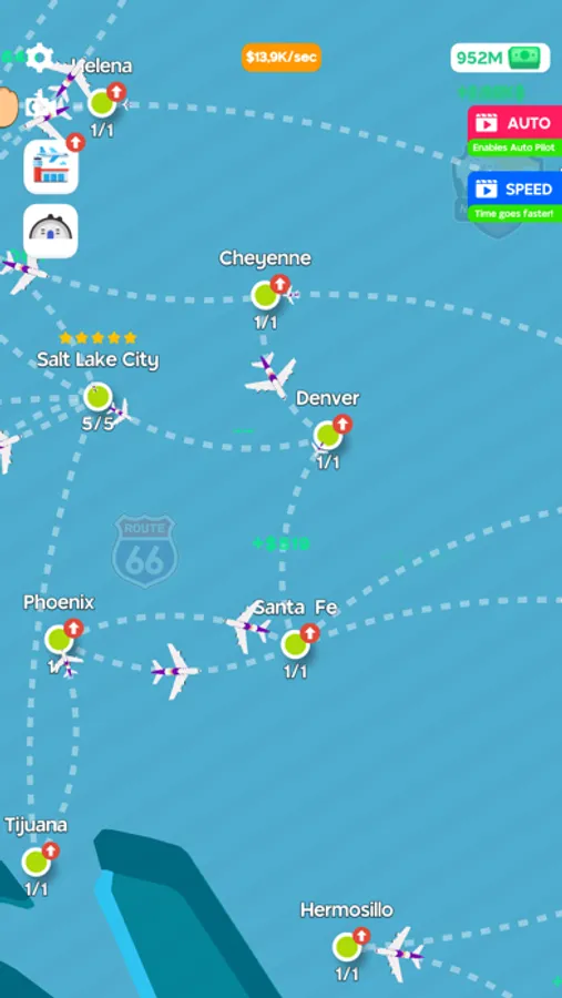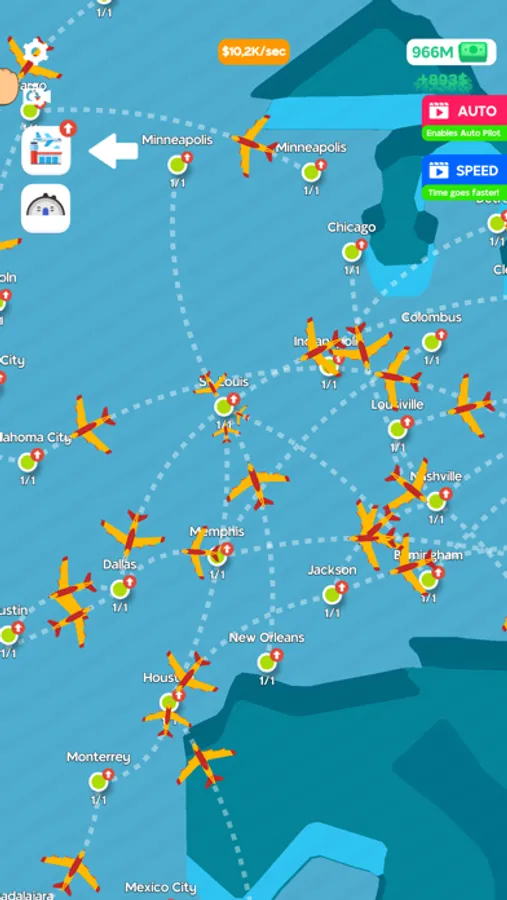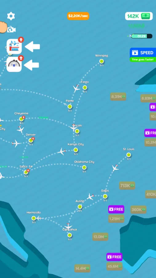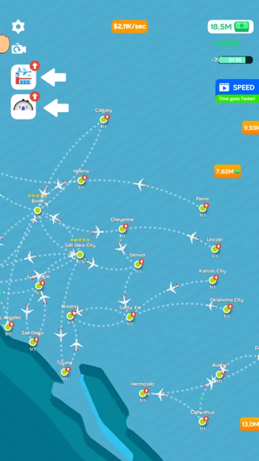 As your planes land, you'll earn cash. Spend money on increasing your destination limit, raising prices, and upgrading your fleet to travel further and faster.