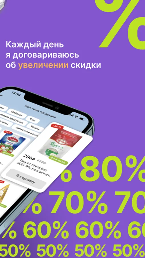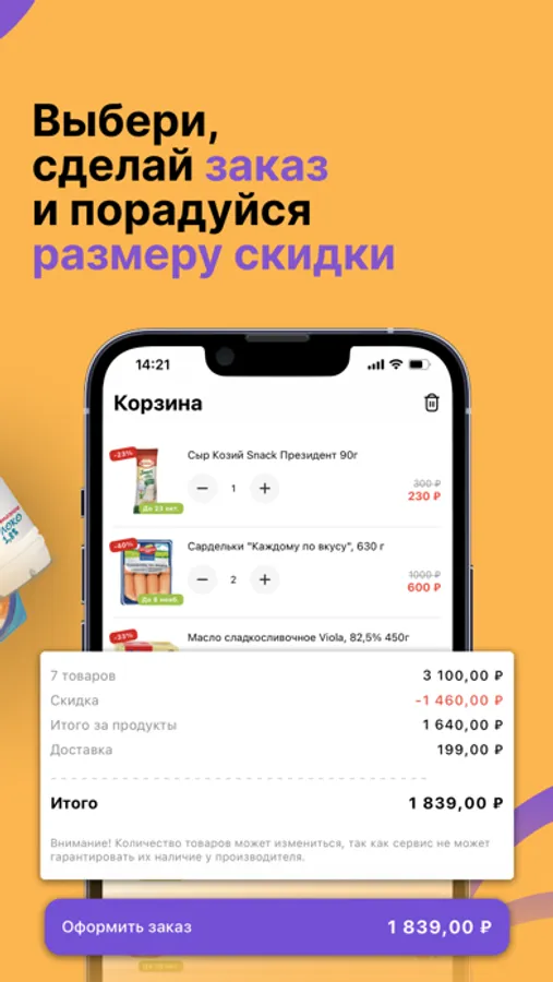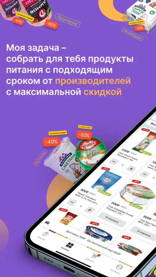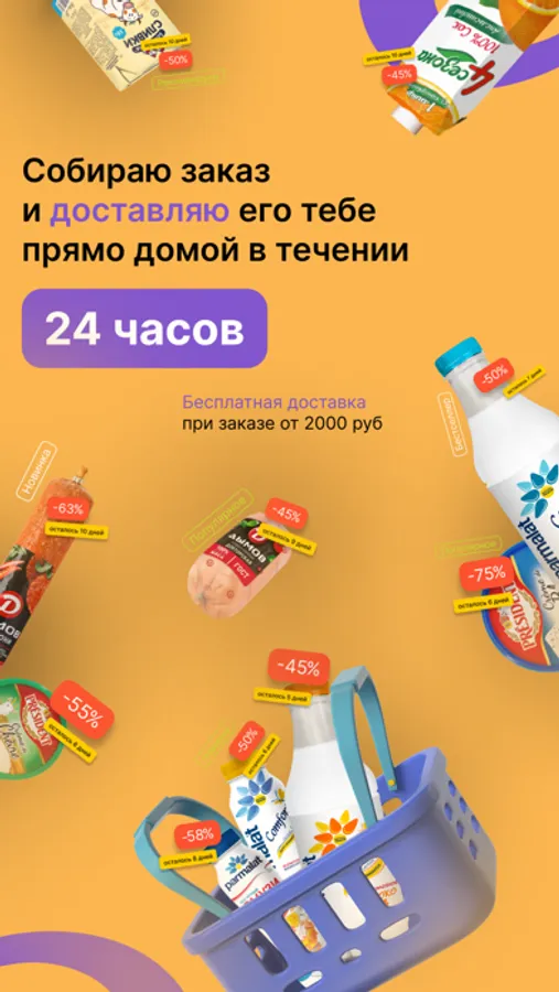 Привет, меня зовут Покупкин, я твой главный помощник по умному шоппингу. Моя задача - собрать для тебя продукты питания с подходящим сроком от производителей с максимальной скидкой. Каждый день я договариваюсь об увеличении скидки, ведь срок уменьшается, и ищу все новые продукты специально для тебя, учитывая все твои предыдущие заказы. А еще я собираю для тебя заказ и доставляю его тебе прямо домой в течение 24 часов.