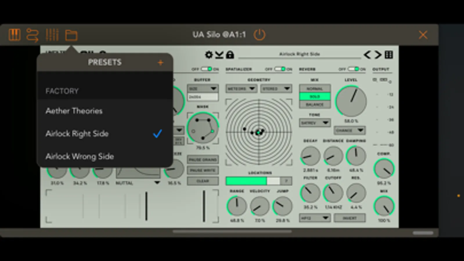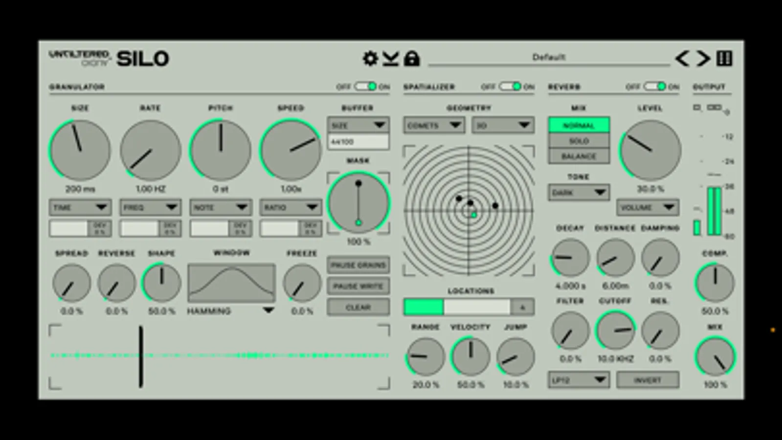 Silo's first section, the granulator, breaks the incoming signal to tiny little bits (called "grains") before reconstructing it with massive amounts of control. You can change the speed and pitch of the signal independently and in real-time!