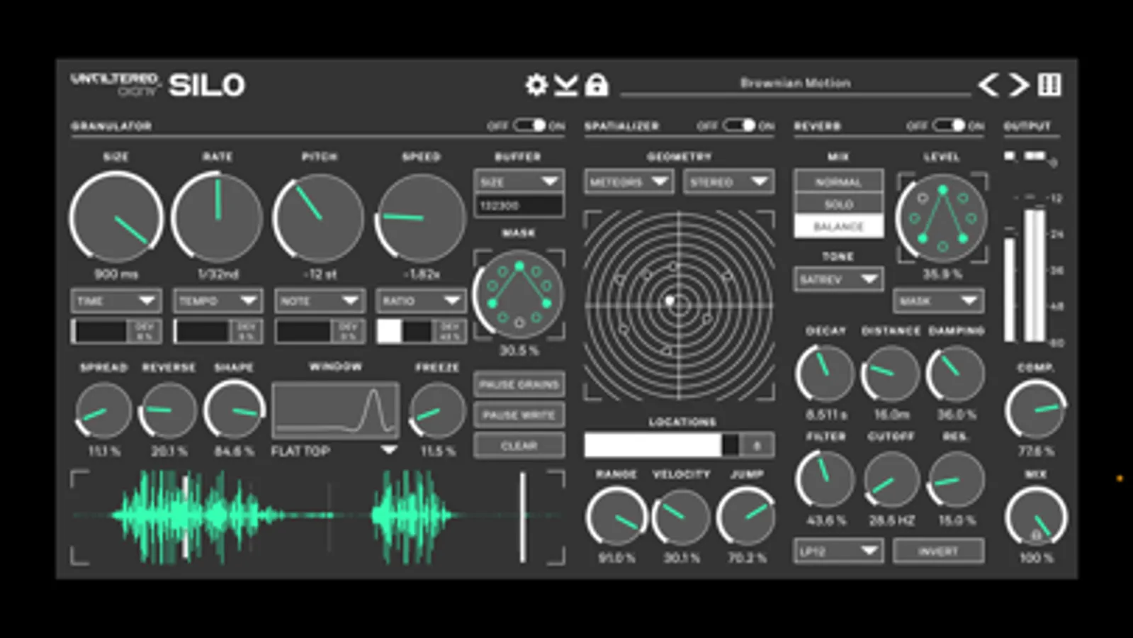 These grains are then sent to Silo's unique spatializer, which throws the grains all over the stereo field. The spatializer contains a number of motion algorithms to add trajectory to your grains, such as the orbital "Moons", the shooting "Meteors", or the squirmy "Biological". After using this spatializer, you'll never want to use a traditional auto-panner ever again.