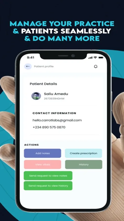 • Voice call, video call and text messages with patients, hospitals, laboratories and Pharmacies on a patient’s prescription in real time.